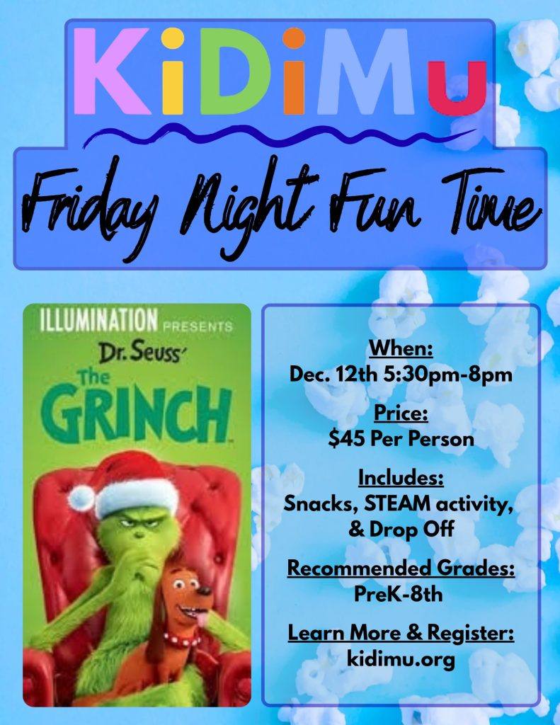 Join us for Friday Night Fun Time: The Grinch on Friday, Dec. 12th, 5:30–8 pm. Kids in PreK–8th grade will watch The Grinch, enjoy snacks, a fun STEAM activity, and supervised drop off playtime in the museum.